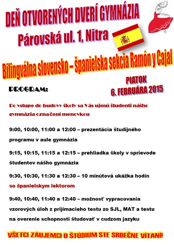 V piatok 6. februára 2015 sa konal Deň otvorených dverí v bilingválnej slovensko-španielskej sekcii nášho gymnázia. Ďakujeme organizátorom (študentom, učiteľom, španielskym lektorom), ktorí pre záujemcov pripravili prezentáciu študijného programu, prehliadku priestorov gymnázia, ukážku hodiny so španielskym lektorom, a tiež možnosť vypracovania vzorových úloh z prijímačiek.
